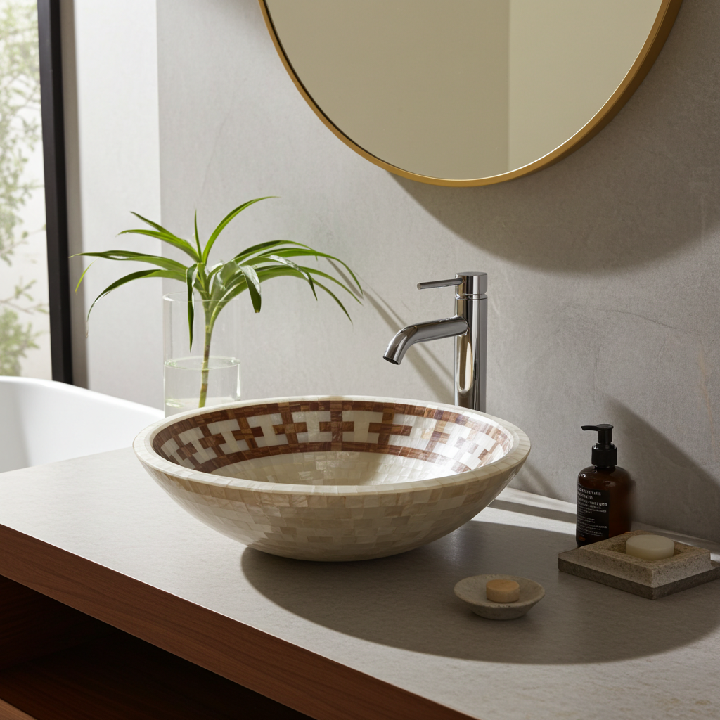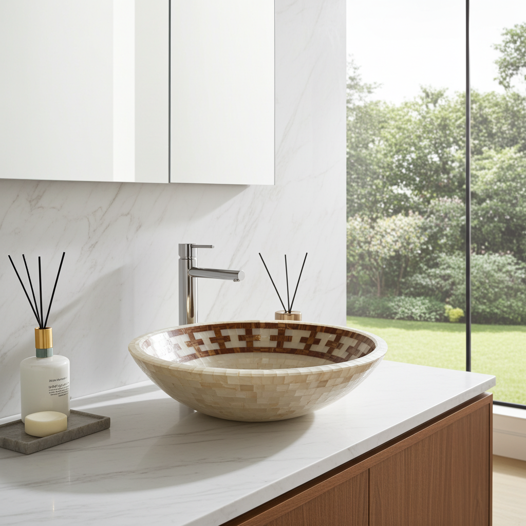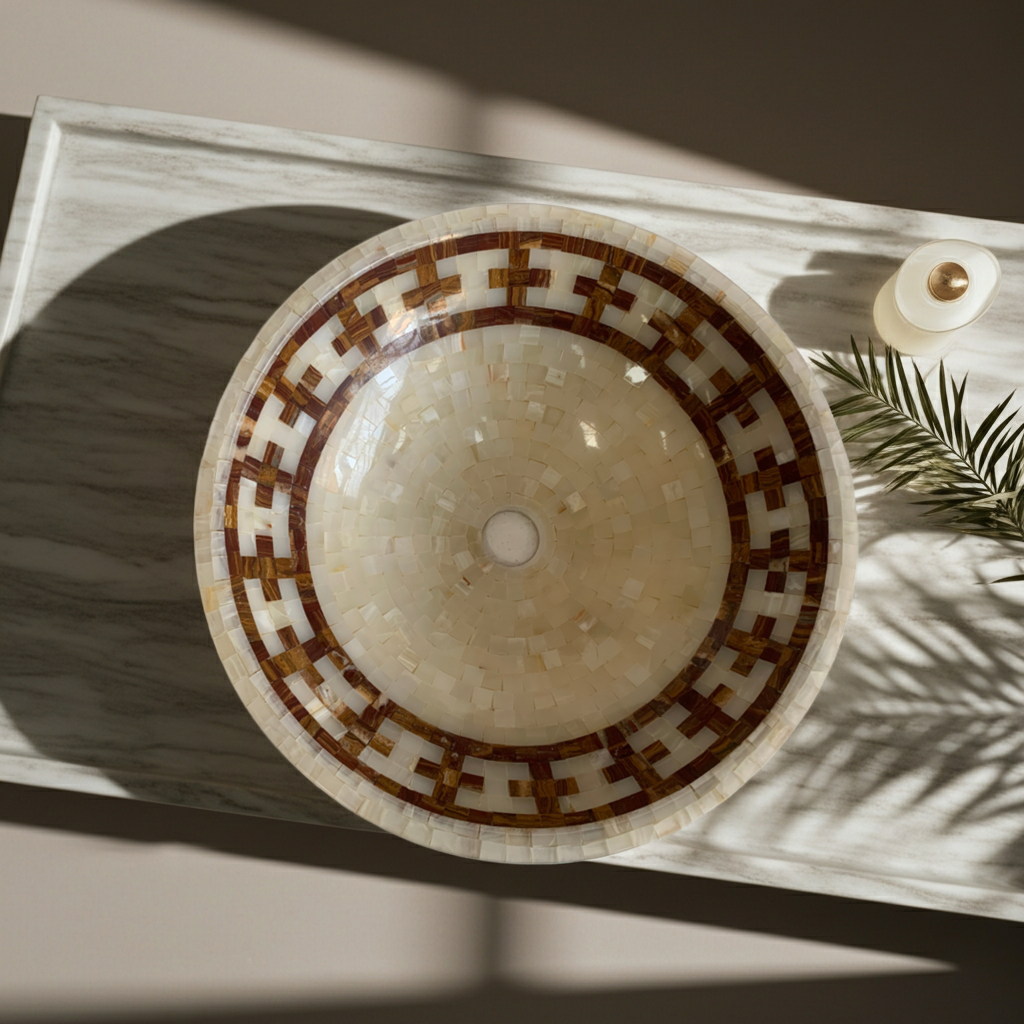 Elevate your bathroom with this stunning handcrafted onyx mosaic washbasin. Each piece features unique natural stone patterns with warm honey and cream tones that create a luxurious focal point.