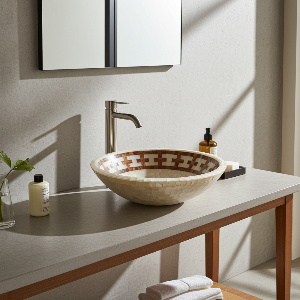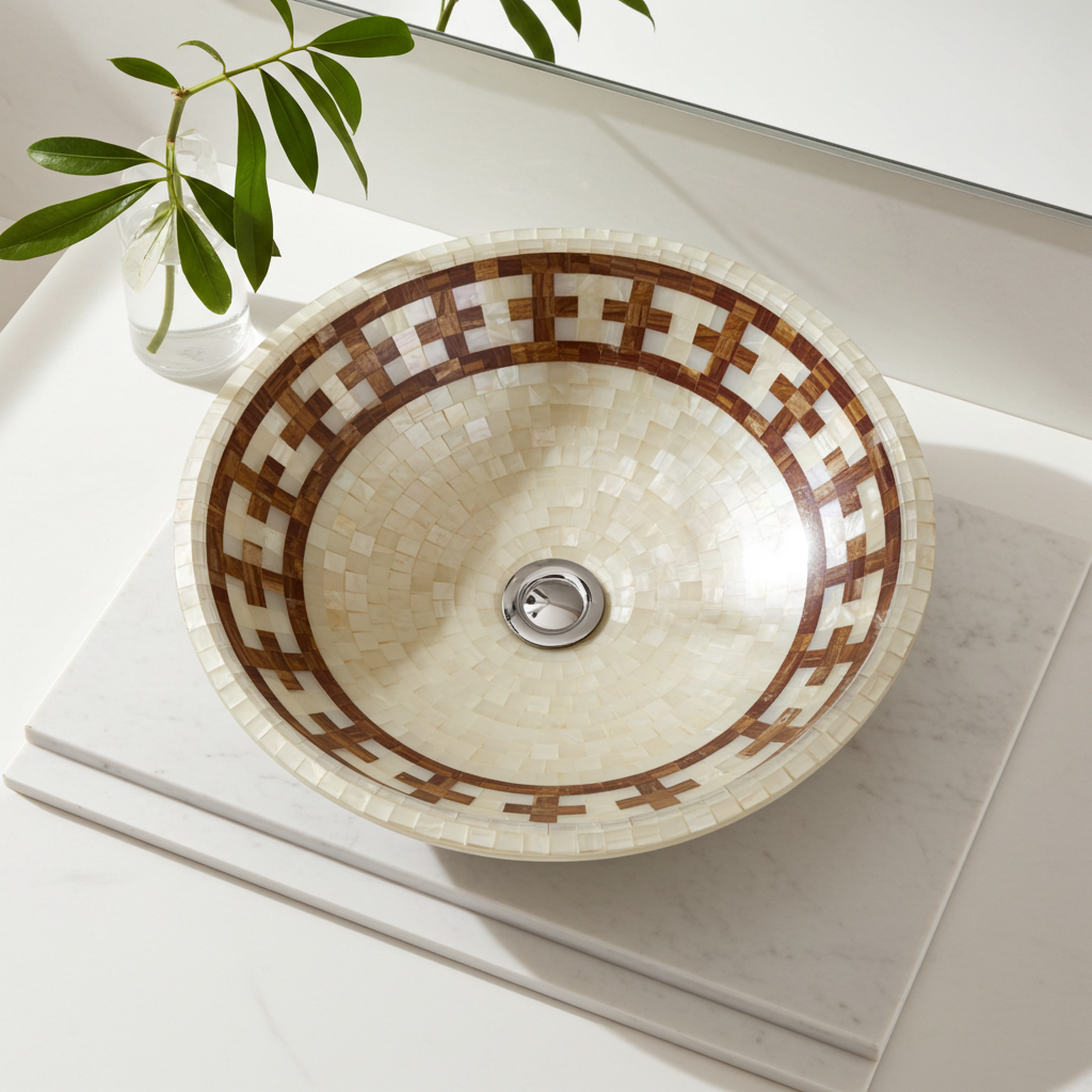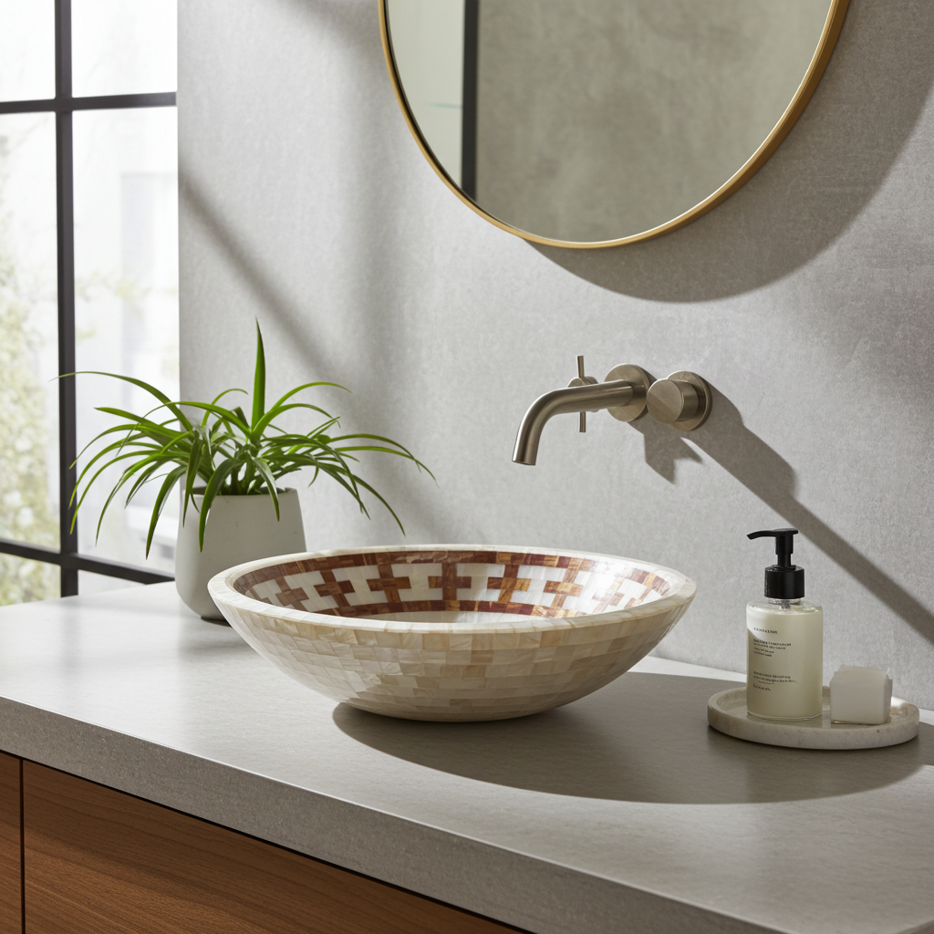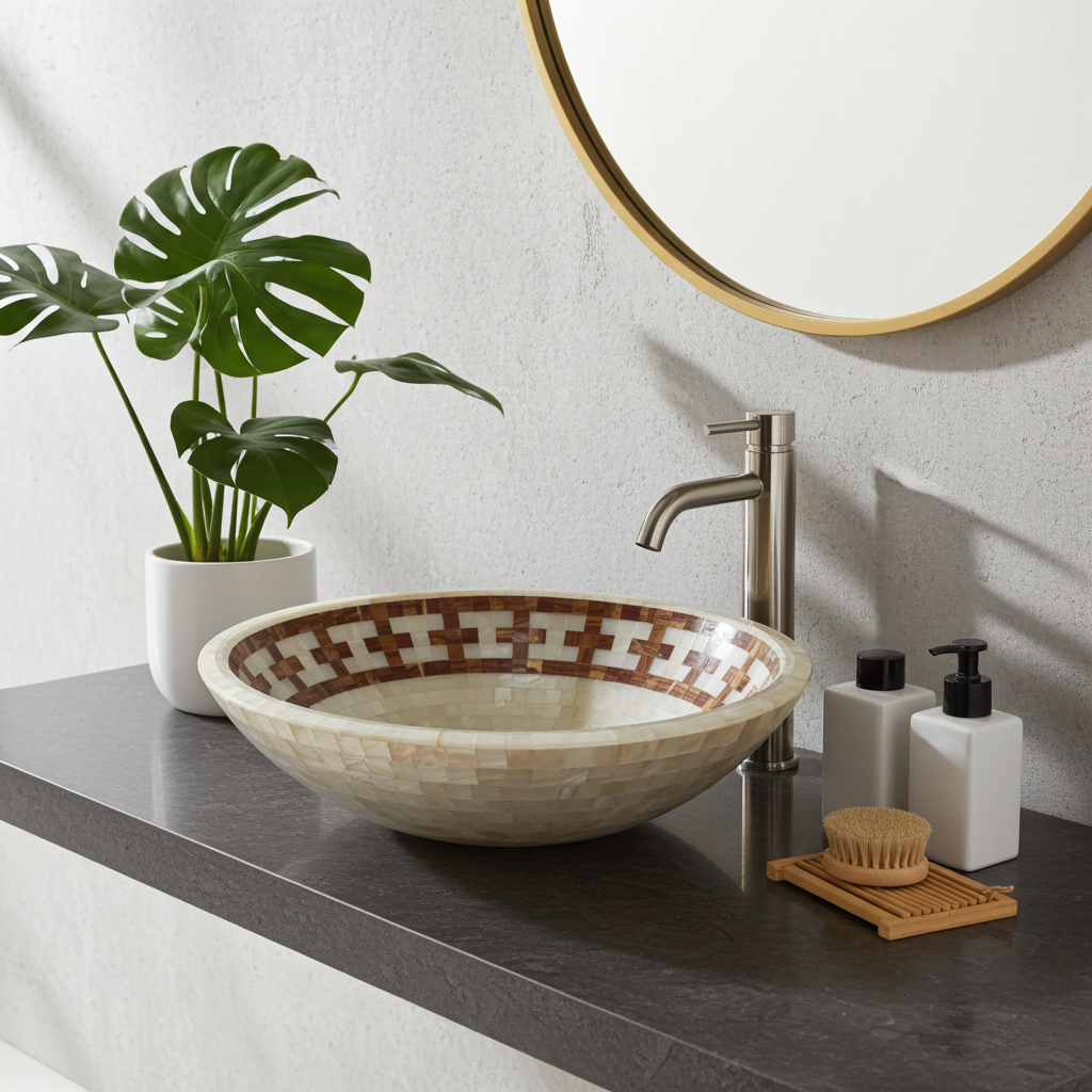 Elevate your bathroom with this stunning handcrafted onyx mosaic washbasin. Each piece features unique natural stone patterns with warm honey and cream tones that create a luxurious focal point.